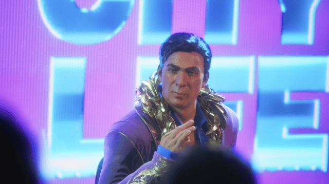 注意这里旁白的语境转换,从背景介绍转到介绍势力,The mayor stepped in where the government couldn't(市长接手了政府无力管控的地带),在聚光灯下身穿华服的男子很可能是市长,结合台词推测,他可能拉拢了某一组织,以 “维持秩序” 之名实质掌控城市,是欲望港表面规则的制定者。