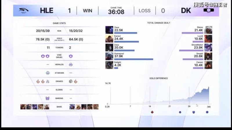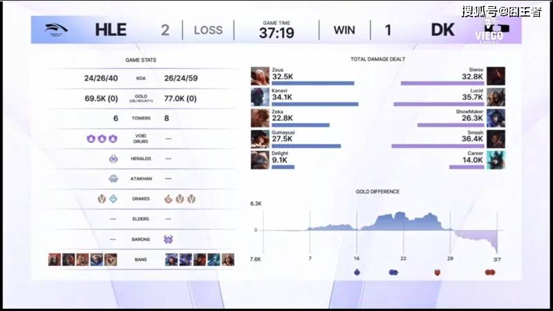 结果这一局比赛,HLE在前期就利用优势,打出了4000的经济领先。比赛第30分钟左右,HLE大龙逼团先后一波打出1换4并拿下大龙;比赛第32分钟左右,DK抓到HLE上野将其击杀,但HLE迅速稳住局面;最终比赛第36分08秒,ShowMaker辛德拉埋伏失败被Zeka发条单杀,HLE击杀DK双C后迅速一波。