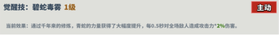 描述:通过千年来的修炼,青蛇的力量获得了大幅度提升,每0.5秒对全场敌人造成攻击力*2%伤害。