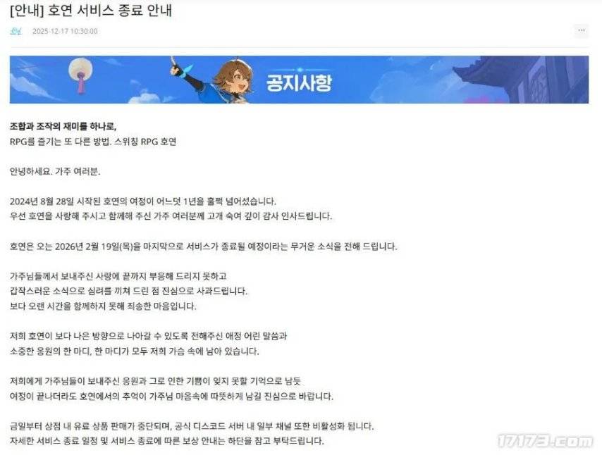 近日韩国知名大厂NCsoft旗下的双端游戏《昊缘》宣布,因难以持续运营下去,游戏将于2026年2月19日正式关服停运。