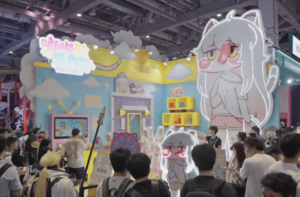 先来说说线下部分。在今年的BW (Bilibili World)漫展上,各家厂商都在拼命搭建华丽的展台、邀请知名Coser站台,以此展示产品的高级感。而《嘟嘟脸恶作剧》的展区却显得格格不入——他们直接搬来了一个巨大的、滑稽的大舌头装置。