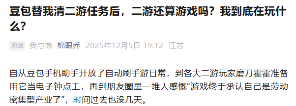 前段时间,豆包手机助手开放了自动刷手游日常的功能,在玩家群体中引发了不小的震动。其实这事并不稀奇,早在AI之前,各种自动脚本和代打服务就已经存在。