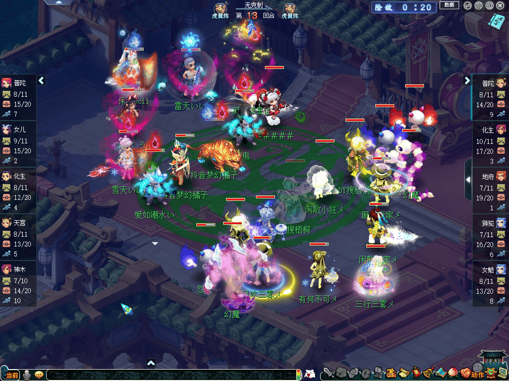 比赛前期,钓鱼岛采用了力压输出点的打法,西栅老街则是选用了清宠策略。就比赛情况来看,由于钓鱼岛拿到物理一速,不仅导致西栅老街的物理输出很难出手,还帮助女魃墓构建了“双幻魔”阵型。比赛第13回合,钓鱼岛凭借力普陀的进攻成功压倒西栅老街神木林后,就彻底封锁了对手清幻魔能力,逐渐形成“以多打少”的优势。