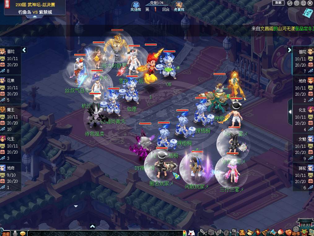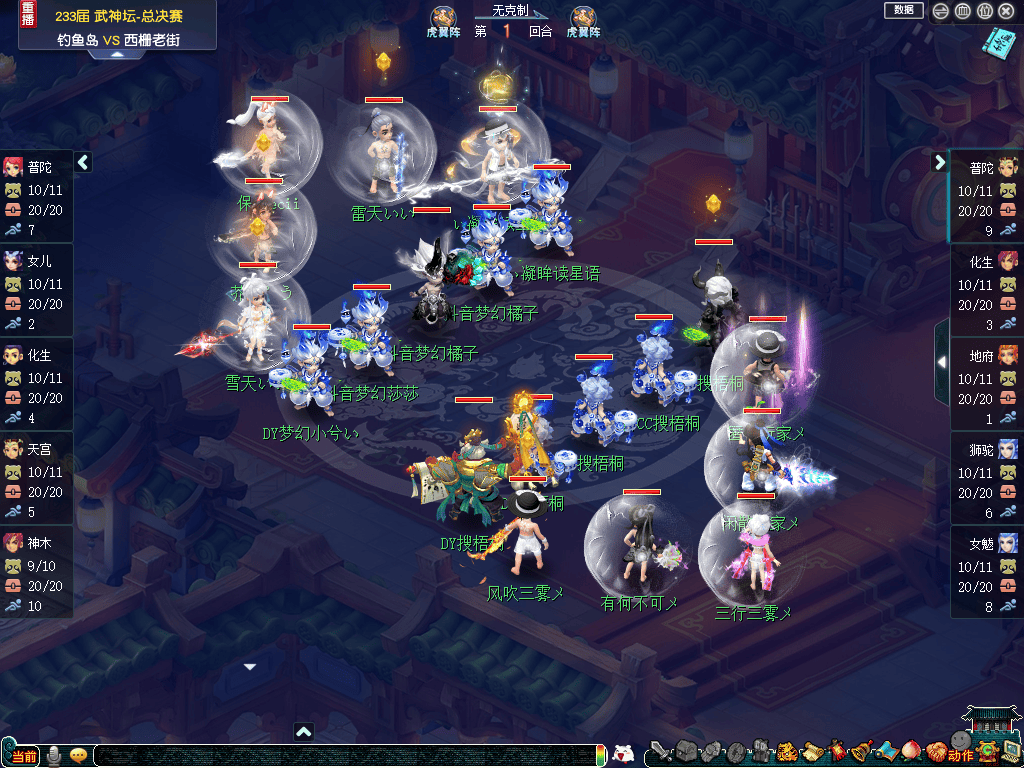 比赛前期,双方均以清宠、加状态为主。不过,手握大克的优势的钓鱼岛并没有着急进攻,而是采用了较为保守输出策略,令紫禁城非常头疼。比赛第8回合,“双幻魔”成型的钓鱼岛果断出手,将紫禁城魔王寨达成残血。次回合,钓鱼岛力普陀再度出手,成功压倒魔王寨的同时,还将钓鱼岛全体人物单位打成残血。