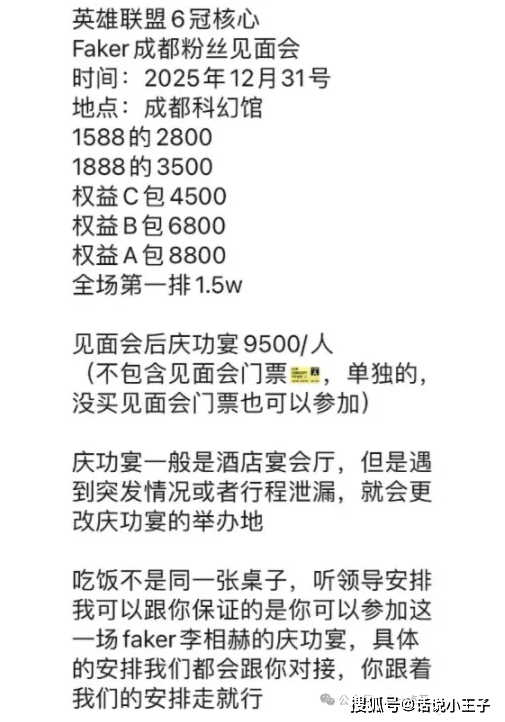 除了这件事情,还有一件事情也值得粉丝关注,那就是Faker的中国行与粉丝线下见面会。官方售价最高达到了6988,最基础的看台门票也要1588,尽管如此,门票也在数秒内售罄。让人意外的是,黄牛居然放出消息声称自己票源充足,并且还兜售与Faker共进晚餐的价格。与Faker共进晚餐的价格已经炒到了9500,这还不包含见面会门票,同时Faker见面会第1排的售价也炒到了15,000。