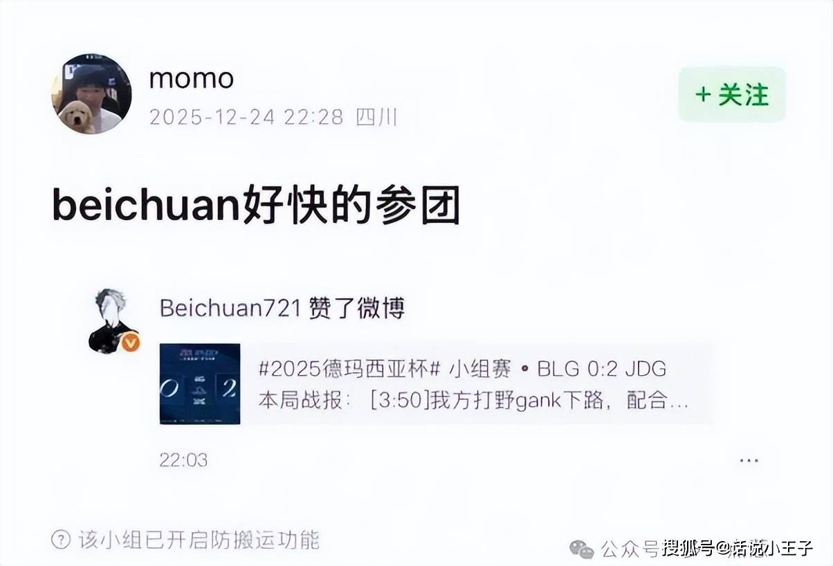 令人意外的是,BLG输给JDG止步德杯小组赛后,北川居然点赞了,还被不少粉丝发现了这一举动。正常情况下,作为前队友肯定是不会点赞老东家输掉比赛的。但是北川这一举动足以说明他已经和BLG撕破脸皮了,甚至BLG输掉比赛,他反而是比较高兴的。这就说明他们之间肯定是有什么事情,现在北川还是自由人的状态,说句不好听的话,北川现在没有队伍,要处于失业的状态。