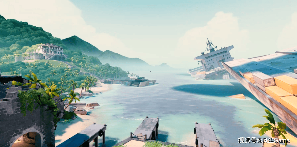 角色设计诚意满满,地图打造同样煞费苦心。为保障竞技性,地图主体部分必须简洁克制,但在那些不可互动的区域,设计师们得以大展身手:微风岛屿里,阳光穿透棕榈叶洒下斑驳光影,尽显海岛风情;亚海悬城中,整座城市漂浮于空中,带来震撼的视觉奇观;霓虹町高低错落的建筑布局,勾勒出赛博都市的独特轮廓。