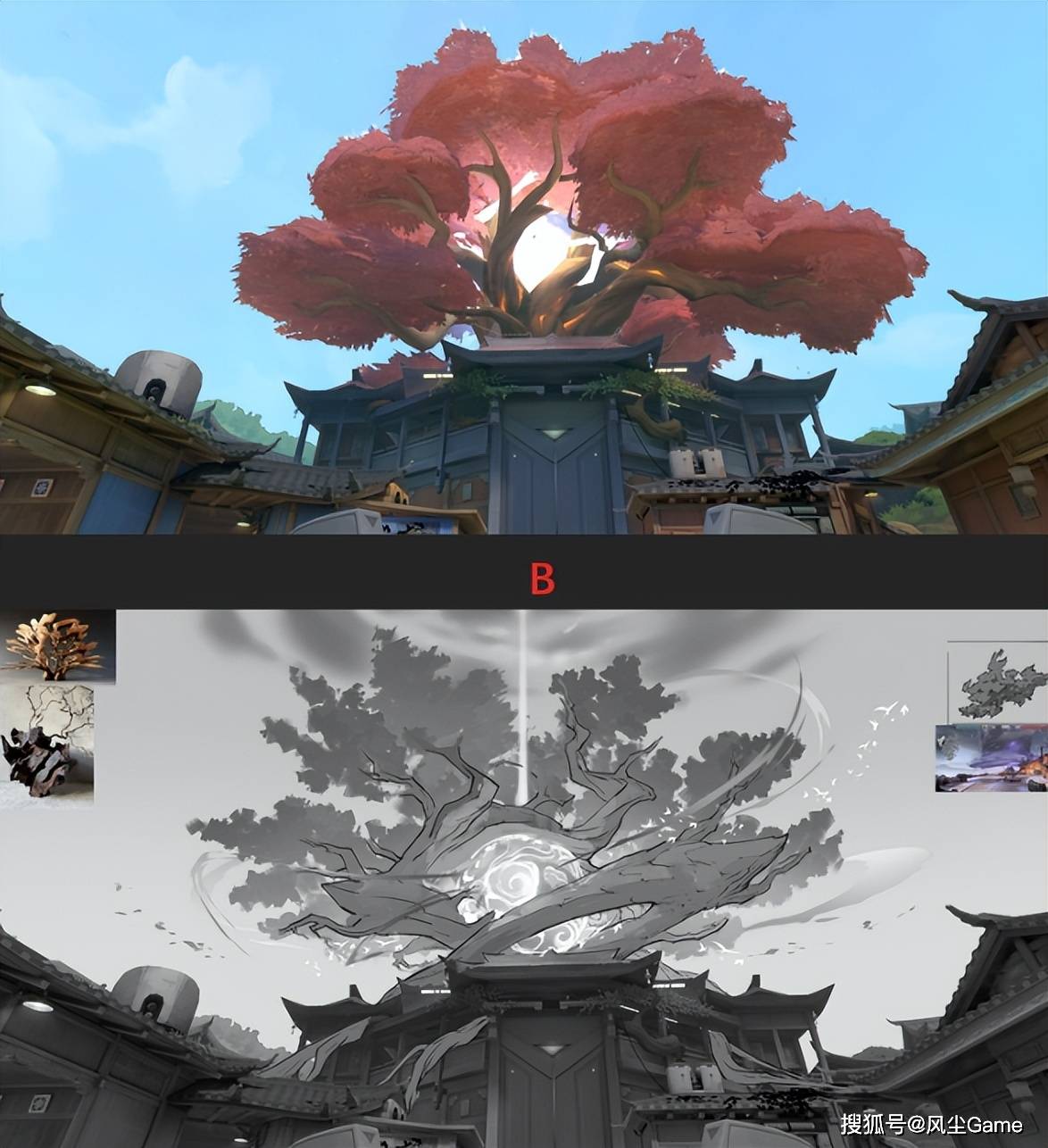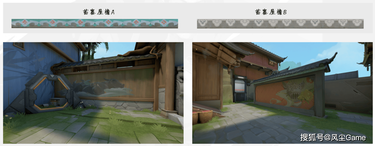 例如在“瓦”手的原创地图“古寨”的设计上,设计师用冷暖色调清晰区分攻守双方,就连墙壁上的绘画也各有不同。为保持色调统一,避免干扰游戏进程,制作组还对苗寨传统屋檐样式进行改良,舍弃了略显突兀的白色,选用与地图整体风格更契合的绿色。