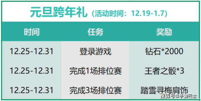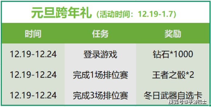 活动分为两个大阶段,第一大阶段是从12月19日正式开启,一直持续到12月31日。活动规则十分简单,任务轻松友好,参与难度极低,只需要在此期间登录游戏并完成几局排位赛,即可领取丰富奖励。为了方便理清奖励,这里做了时间划段,19日到24日的奖励内容包含了钻石、王者之骰日常消耗品和趣味道具“冬日武器自选卡“,详情如下,大家可以看看~