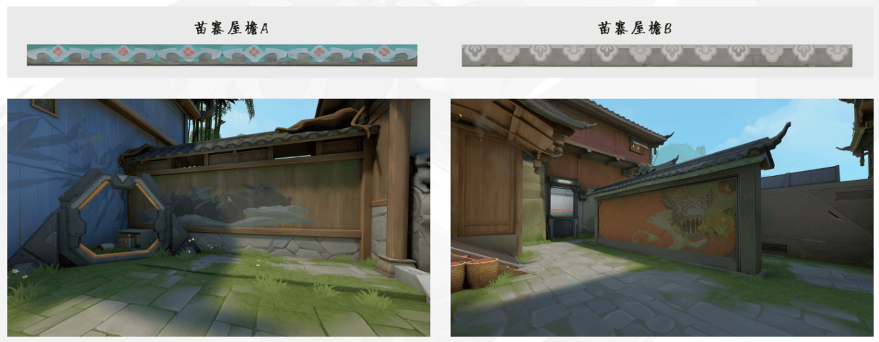 以瓦手的原创地图“古寨”的设计为例,设计师用冷暖色调清晰区分攻守双方,就连墙壁上的绘画也各有不同。为保持色调统一,避免干扰游戏进程,制作组还对苗寨传统屋檐样式进行改良,舍弃了略显突兀的白色,选用与地图整体风格更契合的绿色。这种对细节的把控,不仅提升了地图的视觉效果,也保证了玩家在游戏过程中的专注度。