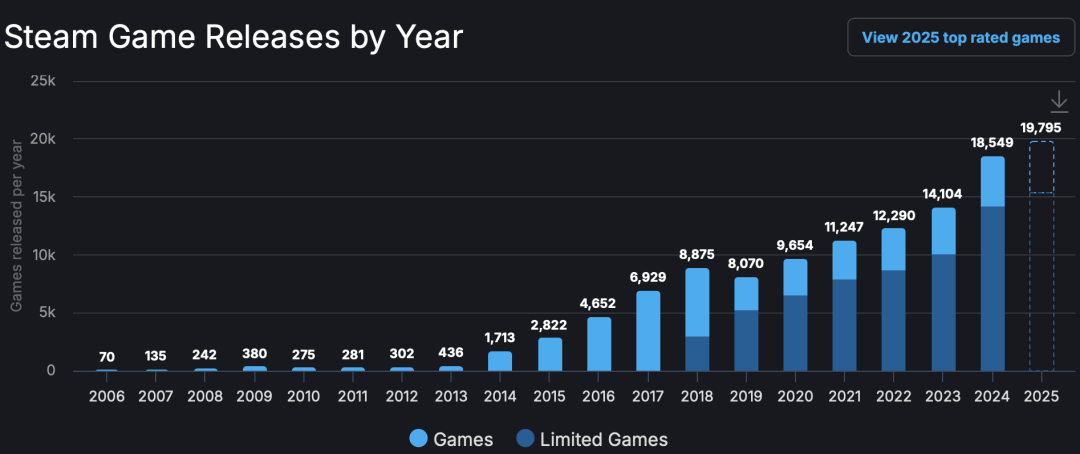 Steam DB 数据显示,2025年全年Steam新游上线数量逼近两万,这个承载了大部分中小团队单机游戏平台的数据仿佛预示着独立游戏市场的繁荣。