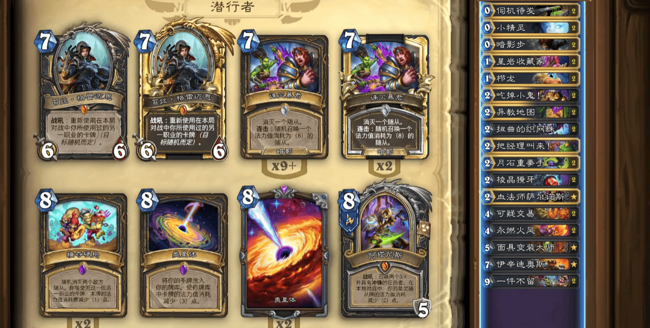 随着近期盗贼的崛起,跳水瞎也迎来一波高光,前期靠着各种各样的牌去蹭血,后期一个跳水斩杀,一个回合打20多伤害还是很常见。当然,如果你的对手很刻意去防守,可以留个传送门,在跳水的回合把传送门打出去。说实话,这套卡组的操作空间非常大,只是面对防战的时候一点办法都没有,天生被克。