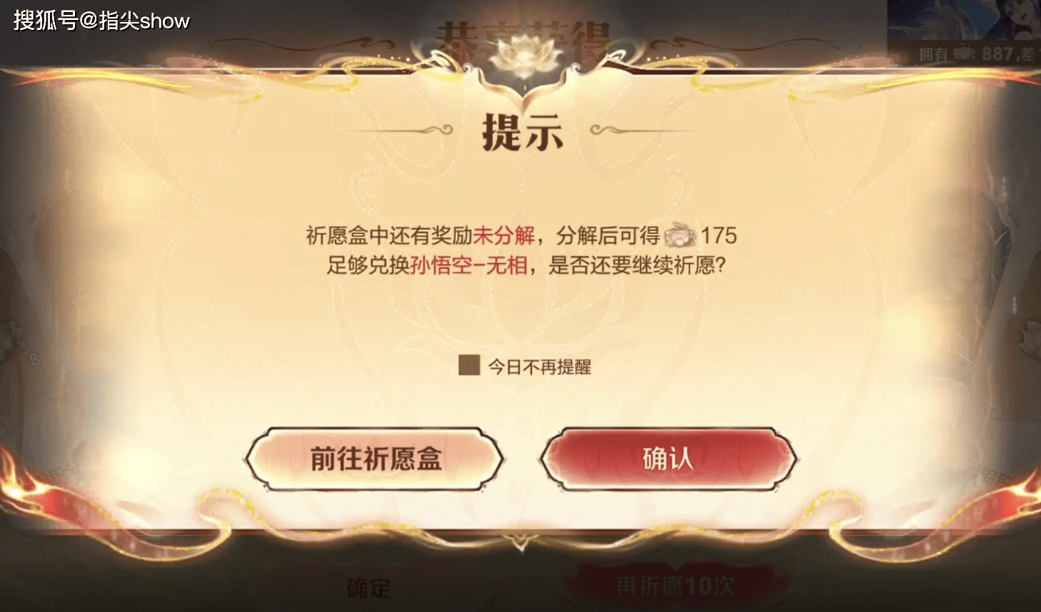 其实从上次铠的神罪就有了这个提示,如果你已经拥有的碎片,加上祈愿盒中的碎片足够兑换一款无双皮肤,那么就会弹出这个提示,可以直接分解祈愿盒中的奖励后兑换无双皮肤,避免了明明碎片 已经够,但还是不小心多抽了一发的情况出现。