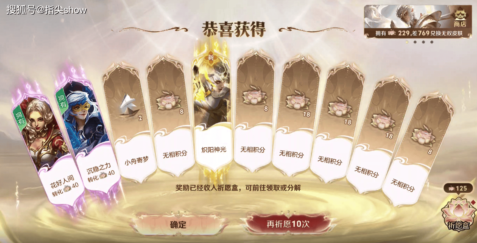第一发十连,抽到了镜的炽阳神光,因为我没有这个皮肤,直接进了祈愿盒,之后抽满40抽后,碎片数量是1062,溢出了64个。