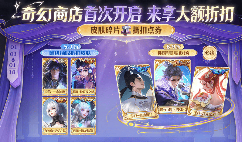 各位可以在奇幻商店奖池中随机抽取25个折扣商品(必然抽到本次奖池中未拥有的限定皮肤),每个限定皮肤优惠为随机8-9折,每个直售皮肤、英雄与个性按键优惠为随机5-7折。购买皮肤时,各位可以在奇幻商店优惠基础上使用皮肤碎片抵扣点券,1皮肤碎片可抵扣10点券,每个皮肤的抵扣上限为5皮肤碎片,是不是很良心呢。
