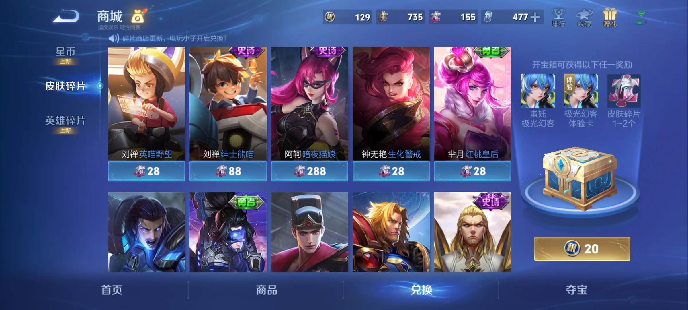 我们目前想要兑换碎片商店里面的皮肤可以直接换,有一些皮肤他是没在碎片商店当中的,官方会每两周对其进行一轮更新轮换,我们必须得等到皮肤上架商店才可兑换。