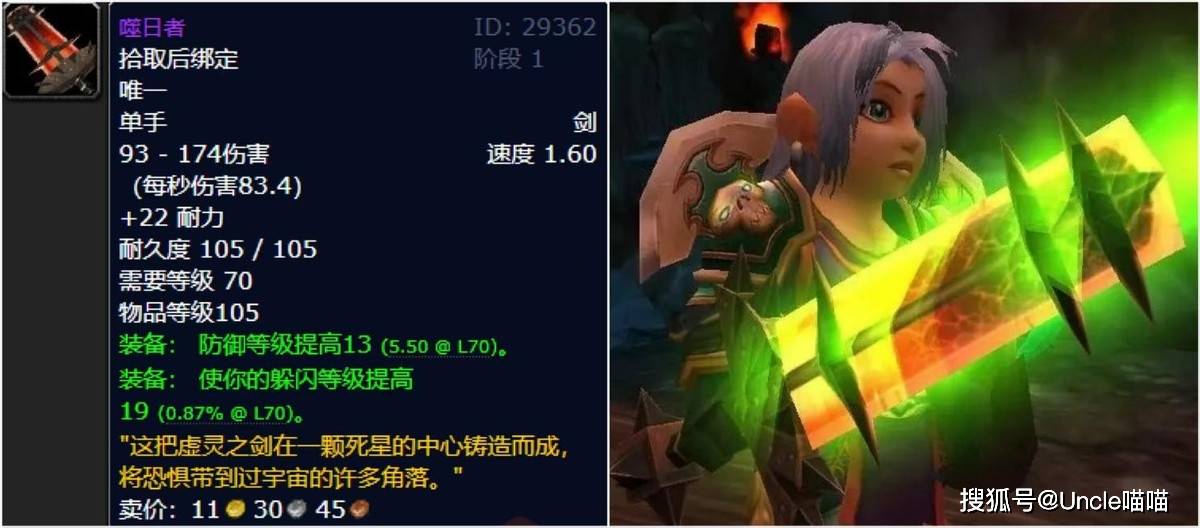 今日份最后的席位喵叔给到的是噬日者,能源舰BOSS计算者帕萨雷恩掉落,这东西可是黄字认证的武器,造型也是极其的帅气,可以说是初期最完美的防御向武器了,喵叔怀旧服把能源舰都给刷吐了也没见到,还好后来拿了国王护卫者,不然就真的要哭了,虽然说国王护卫者肯定比噬日者强,但是噬日者的造型实在是太让喵叔我着迷了,问题就是没见过啊,不过还好这东西喵叔在奥格瑞玛和沙塔斯也没见过几人拥有,确实掉率很低。那么最后的灵魂拷问给到各位大兄弟,你觉得TBC五人本最难刷到的紫色武器是哪一款呢?我们评论区见!