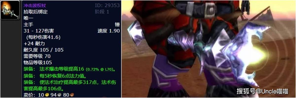 本月15号周年服燃烧的远征版本前夕补丁也是即将实装,让喵叔也是哈喇子直流有点迫不及待,所以喵叔先制定一个小目标,就是届时一定要刷到TBC版本我个人认为最难刷到的5款紫色武器,第一款就是暗影迷宫摩摩尔掉落的冲击波权杖,这款单手锤对于奶骑来说前期可称极品,造型也是和其名字遥相呼应有着音波环绕,难刷的点有两个,第一是掉率很迷几乎见不到,其二就是暗影迷宫这个副本真的难度在的,摩摩尔门前那几波怪,不专业的队伍基本上能够一直灭,不难想象,TBC版本奶骑数量还是会一如既往的恐怖如斯,大家届时也可以去暗影迷宫冲一波,看看能否拿下!