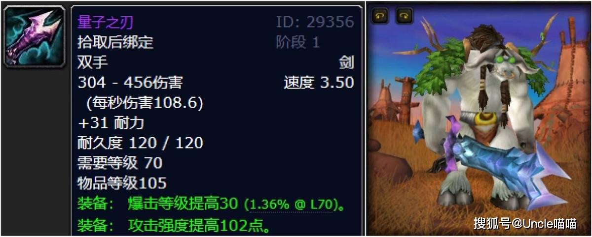 喵叔敢说知道第三款量子之刃的大兄弟,必然是TBC版本的资深老玩家无疑,可能很多法系输出玩家甚至不知道他的存在,这东西出自于黑色沼泽十八摸,BOSS埃欧努斯掉落,喵叔万年TBC玩穿了,也才在怀旧服有幸见过一次,战士拿下直接收藏了,据说这东西猎人拿非常不错,毕竟绿字高暴击和攻击强度摆在这里,至于武器战士还是少啊,惩戒骑不知道是否喜欢?