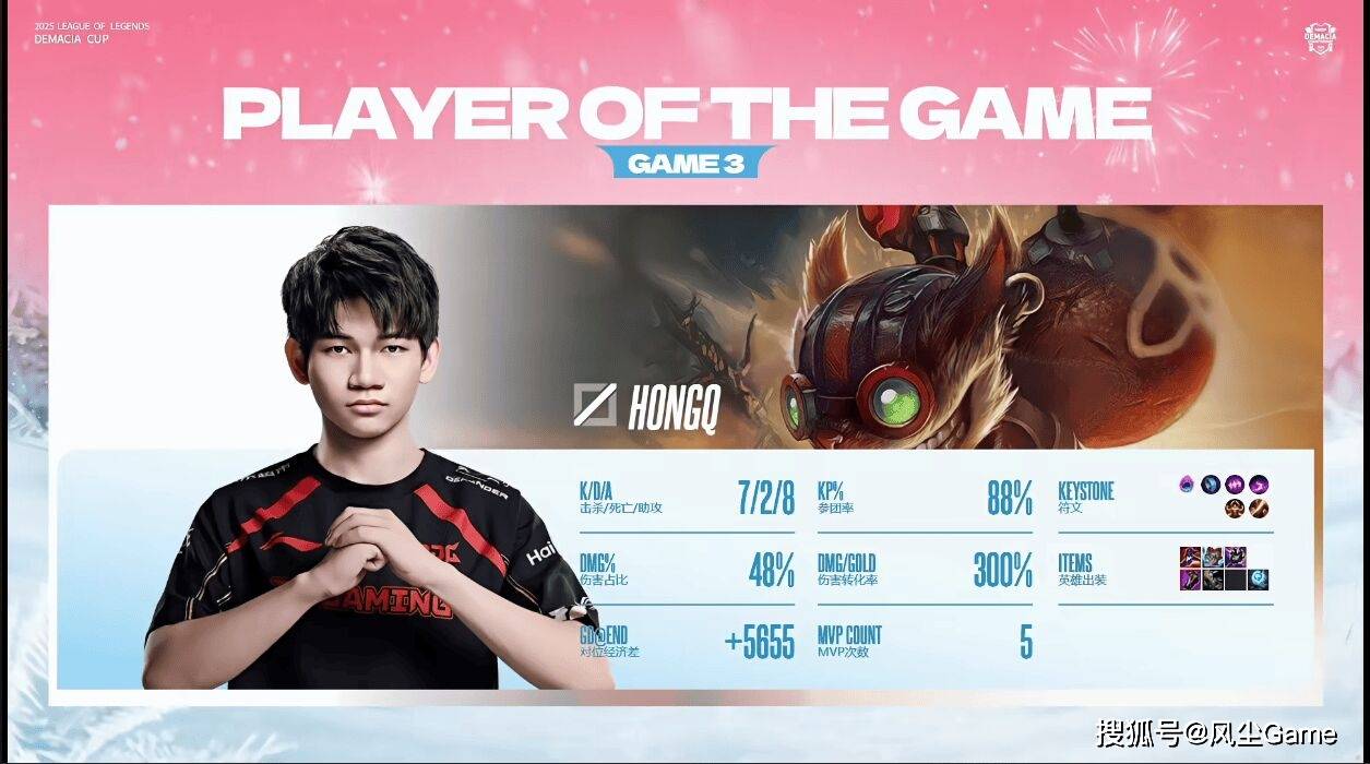 赢下的三局,有两把都是HongQ的MVP,看来他已经适应京东的节奏了,单从这一场BO5来看,京东绝对是未来可期的,上野辅三兄弟,这场比赛表现也都很出色,唯一拖后腿的,反而是公认的队内大腿嘎子,后面的两局,嘎子都有点蹭局势,最后一把甚至没蹭明白,大优势飞进去送。