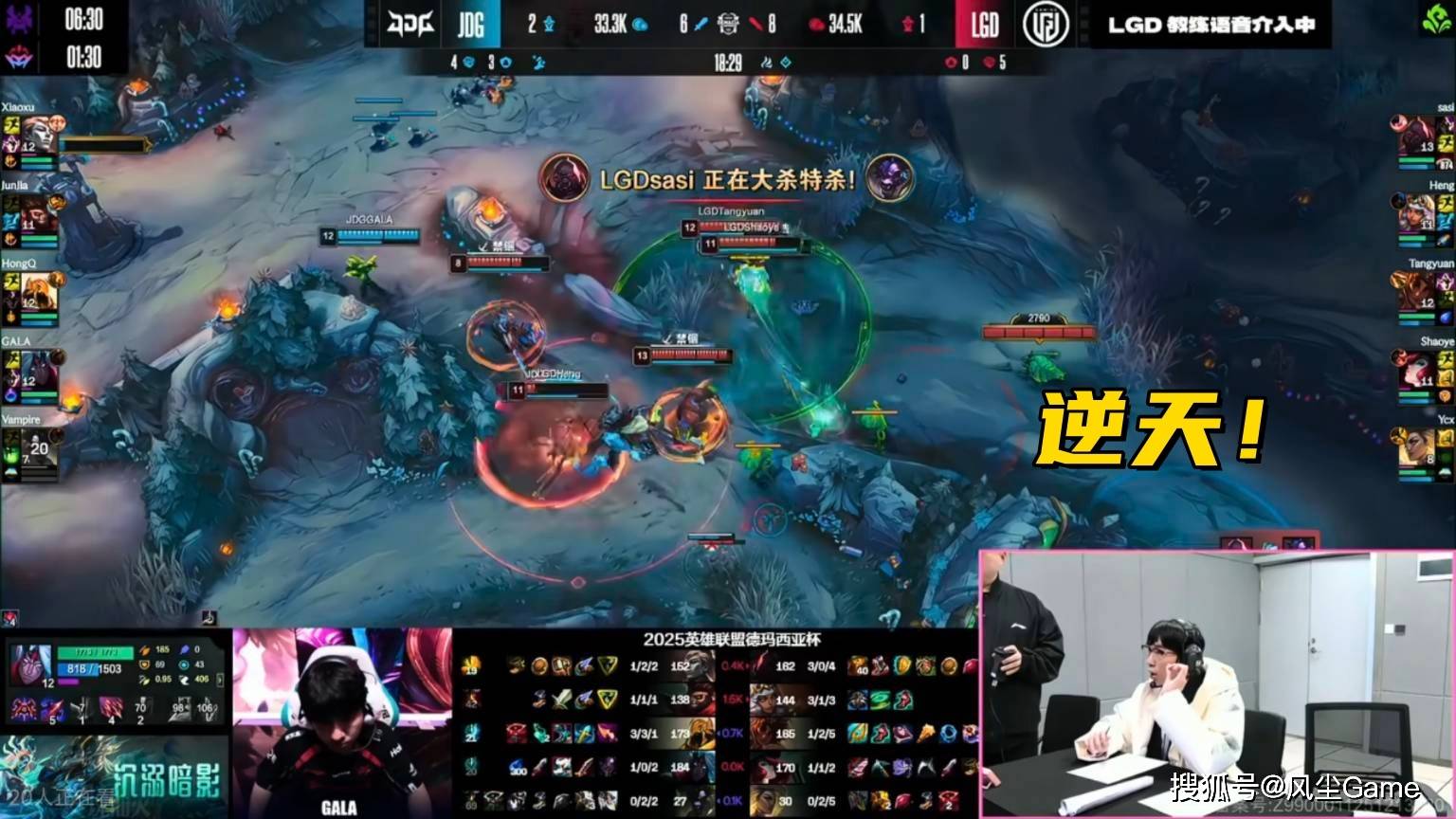 LGD虽然打进了四强,但实力跟JDG差距太大了,教练在比赛的时候,更是上演了搞笑名场面,第一局18分钟左右,LGD就已经双龙开局了,停牌龙团战,上辅蹲草先秒一个,5打4的情况下,只要稳一点,稍微拉扯一下,老干爹团战肯定是能赢的,结果教练突然发力,打团介入了语音。