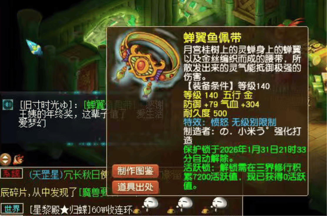 这位欧皇开年所获的神器,就是这条防御79、气血331的140级无级别愤怒腰带!要知道,X9顶尖高手为了追求高抗性和抢速度,往往不得不舍弃愤怒特效,只选择无级别装备。而这条集齐两大顶级蓝字的腰带,无疑将他们的实力提升到了全新维度。