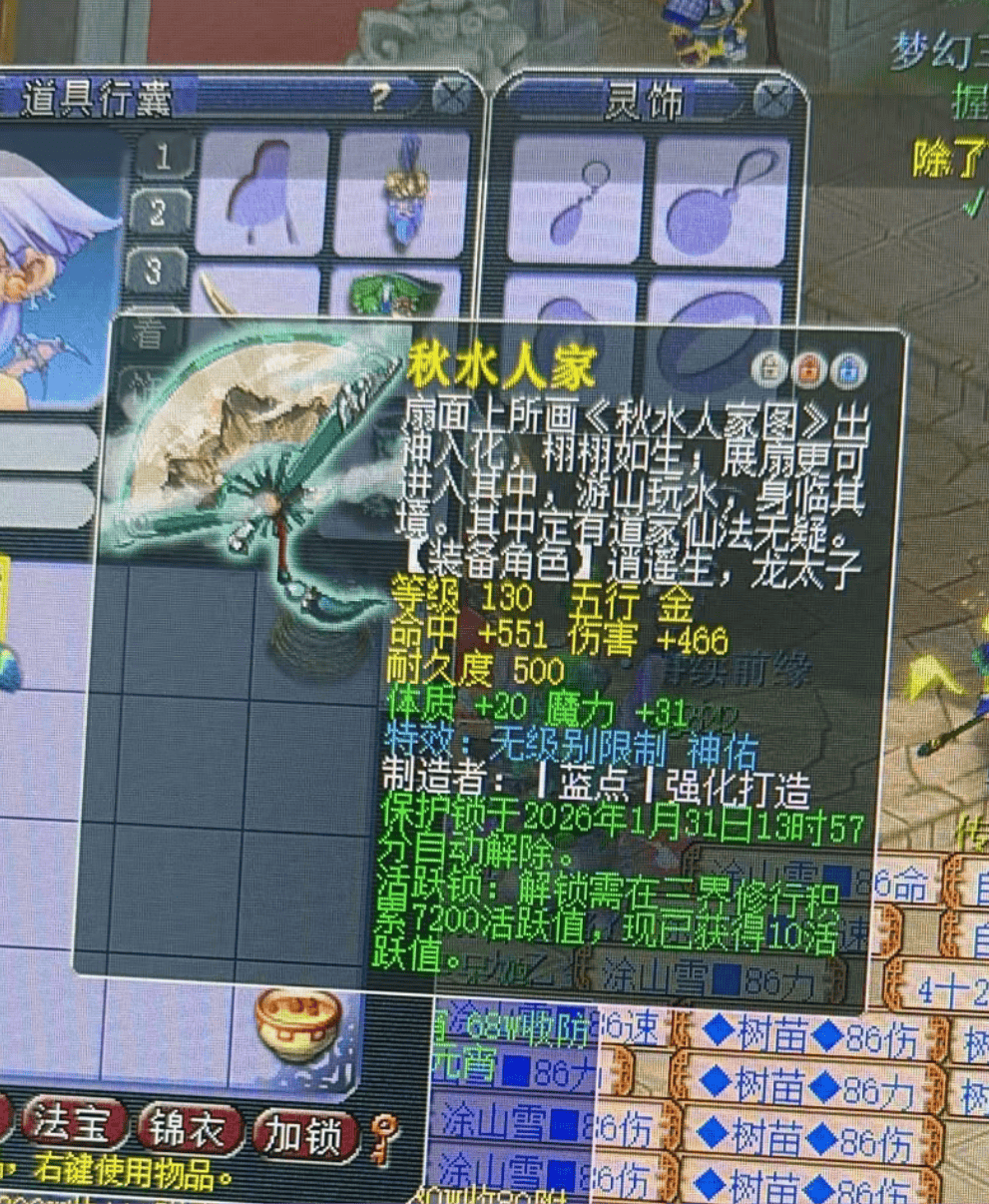 与此同时,另一名少侠在鉴定130级武器时同样成功逆袭,喜提“逆天双蓝字”——一把初伤466、体魔双加51的无级别神佑扇子。这把武器仅需镶嵌16锻太阳石,就能带来高达176点的法伤加成,非常适合X9PK圈的神木、龙宫、魔天宫等法系门派。