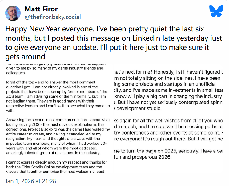 马特·菲罗尔于2007年创立了 Zenimax Online,并帮助Bethesda将《上古卷轴OL》打造成了一款顶级MMORPG。去年夏天,微软在公司内部进行大裁员,Zenimax Onlin工作室有数十名员工被裁,菲罗尔也因此突然离职。微软还取消了他正在开发的一款在线多人项目“Project Blackbird”。最近,马特·菲罗尔打破沉默,解释了离职原因,也证实了大家的猜测。