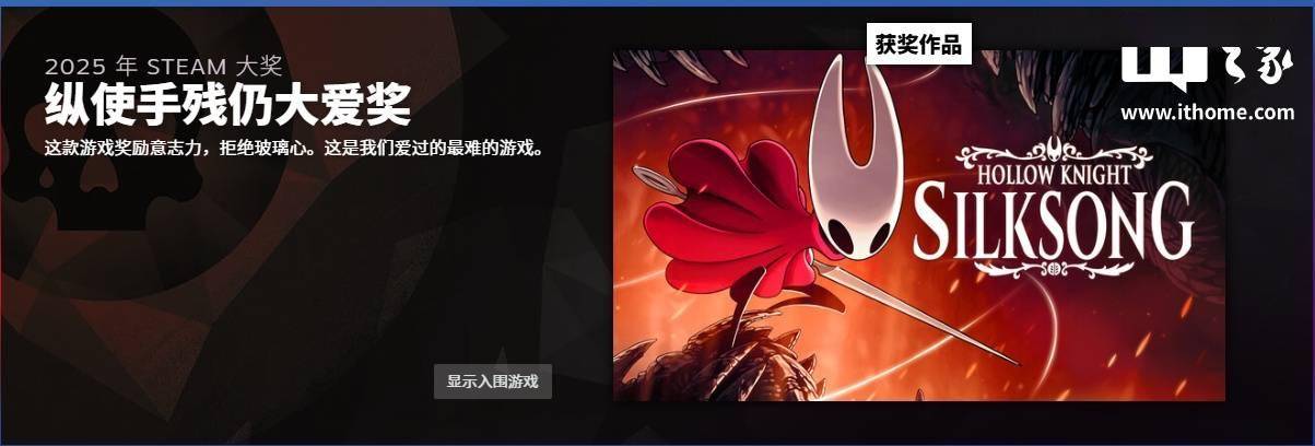 IT之家注意到,《空洞骑士:丝之歌》同时还斩获了“纵使手残仍大爱奖”奖项,该奖项专门授予那些玩法极具挑战性的游戏。值得一提的是,该奖项的其他提名作品包括《流放之路 2》《艾尔登法环:黑夜君临》《漫威争锋》以及《燕云十六声》。