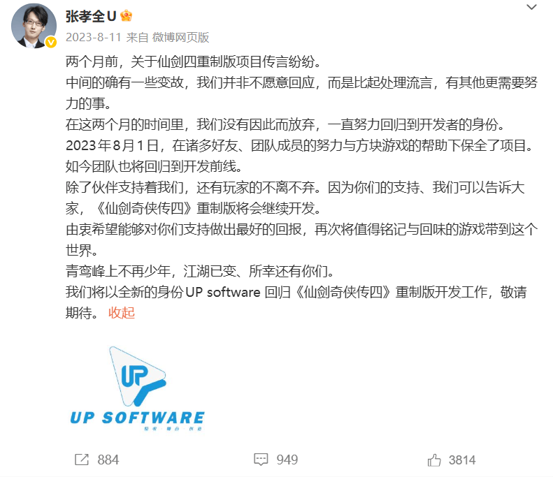 此外,《仙剑奇侠传四》重制版2022年就已经公布立项,即使后来因为种种原因,团队重组为了现在的UP software,也最迟在2023年8月就已经恢复了开发,绝对不是什么看到《光与影:33号远征队》大火后才出现的跟风之作。