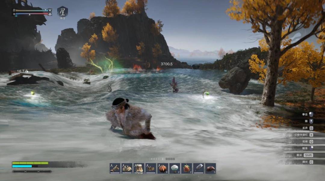 不仅如此,Demo地图中的制高点还存在一处能够改变天气的交互点,当玩家到达交互点后,便能将世界天气强制改为“暴雨”,此时地图上的水源将急剧增多,山间的天然堤坝也会蓄起洪水。如果玩家在此时用地图中的爆炸物炸开“堤口”岩石,就能达成“决堤”效果——在灾害面前,玩家和地图中的所有生物均被一视同仁,玩家建造的建筑物和敌方的据点都可能被冲垮,而地图中间的火属性Boss更是会被巨型山洪直接秒杀,让充分研究机制的玩家跳过整场Boss战。