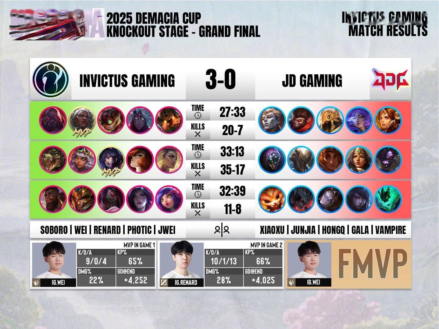 IT之家 1 月 4 日消息,在昨日进行的《英雄联盟》2025 德玛西亚杯总决赛中,iG 以 3:0 的大比分击败 JDG 赢得本次比赛的总冠军,Wei 选手荣获 FMVP。