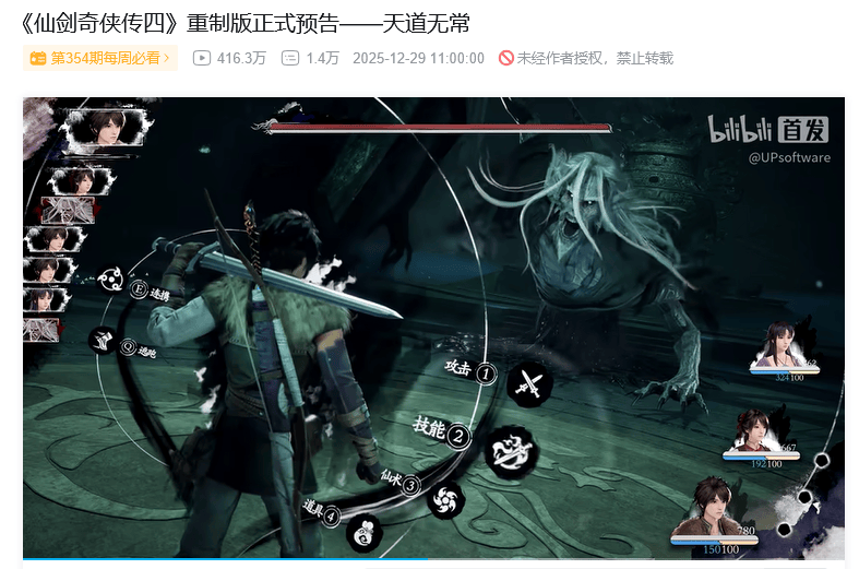 【3】12月29日,由UP software研发、方块游戏发行的回合制RPG单机游戏《仙剑奇侠传四》重制版,发布了正式预告。但预告发布不久后,由于其实机战斗在UI设计、运镜和交互方式等方面的表现酷似2025年的话题游戏《光与影:33号远征队》,引发了社区热议。目前,该PV在B站的播放量已经超过400万。