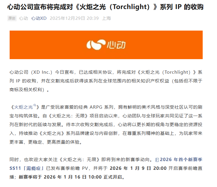 【1】12月29日,心动公司宣布,其全资附属公司XDEntertainment与卖方Runic及ArcGames,以及关联方GoldenArc订立《资产转让协议》,将完成对经典ARPG 系列《火炬之光(Torchlight)》IP 的收购。根据披露信息,本次交易总代价为3718万美元。待交易交割完成后,心动将获得《火炬之光》系列在全球范围内的相关知识产权权益,包括但不限于商标及相关权利。