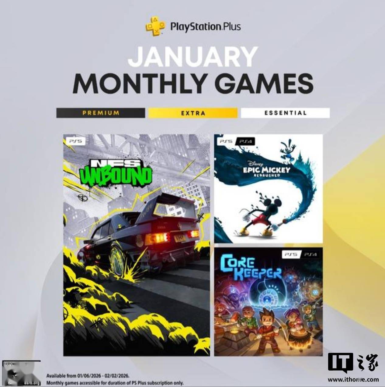 IT之家 1 月 4 日消息,索尼现已公布了 2026 年 1 月的 PS Plus 会免,本月三款会免游戏包括:《极品飞车:不羁(Need For Speed:Unbound)》、《Disney Epic Mickey: Rebrushed》、《护核纪元(Core Keeper )》,玩家可在区服当地时间 1 月 6 日至 2 月 2 日领取。