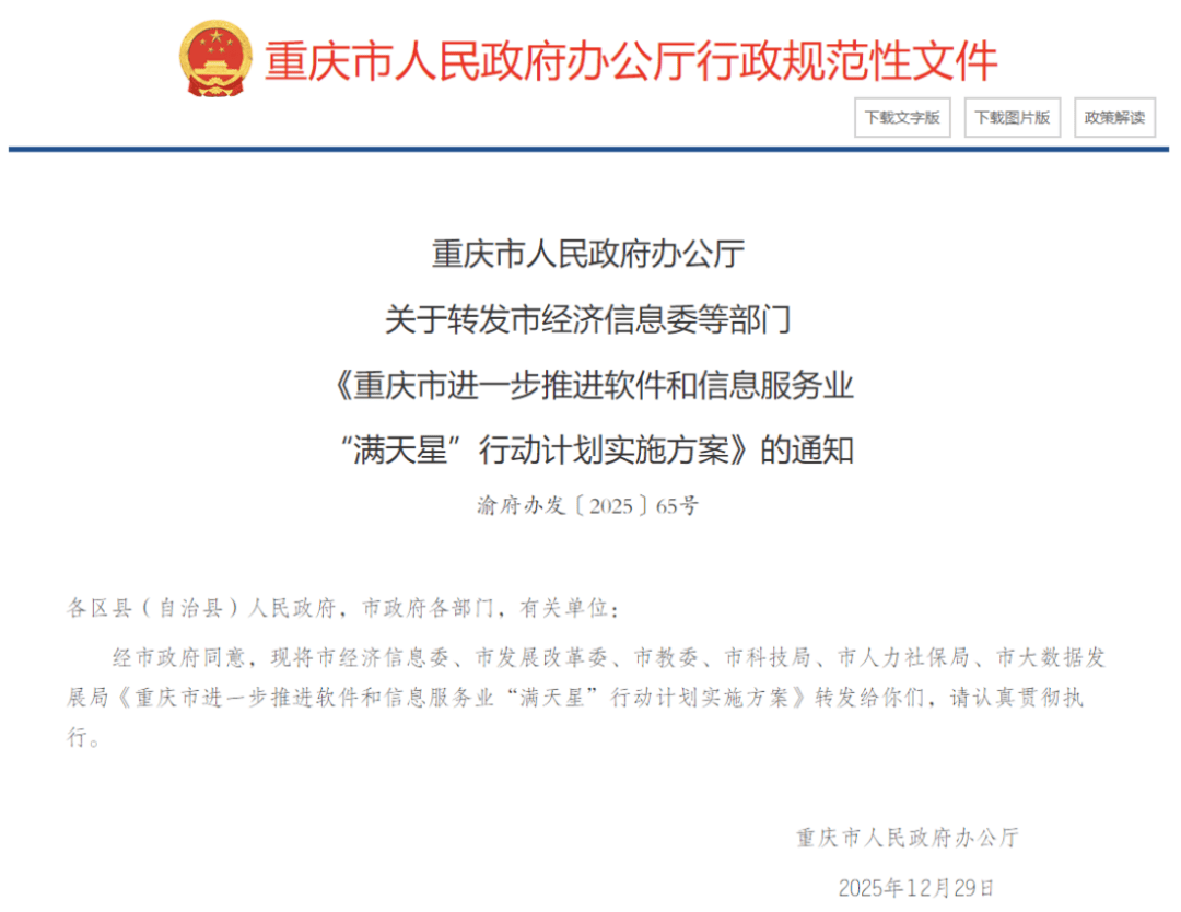 2025年12月29日,重庆市发布《进一步推进软件和信息服务业“满天星”行动计划实施方案》(以下简称“《方案》”),将人工智能作为主攻方向。该方案特别指出支持游戏产业发展,鼓励AI技术与游戏产业深度融合。