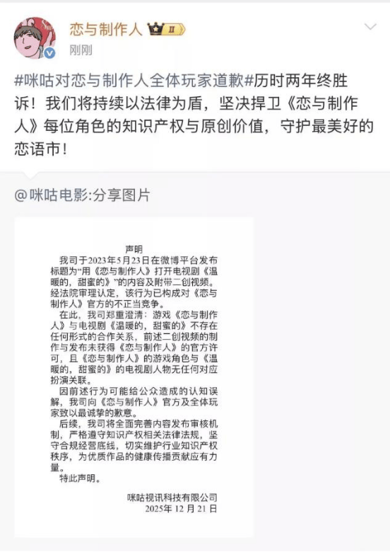 近期,上海市知识产权法院对《恋与制作人》诉咪咕案作出终审判决,认定“咪咕电影”在商业宣传中非法使用游戏原创元素构成了不正当竞争。随后,咪咕电影正式发布道歉声明,针对其侵权行为向《恋与制作人》官方及全体玩家诚恳致歉。