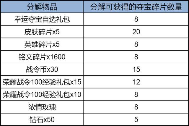 分解道具获得的夺宝碎片如下:幸运夺宝自选礼包、英雄碎片、铭文碎片、钻石这三种可以无脑分解,如果需要这些道具建议从其他途径获取。