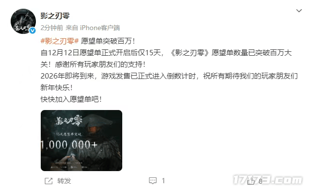 12月29日,《影之刃零》官方宣布:游戏全平台愿望单数量在15天内正式突破了100万大关。