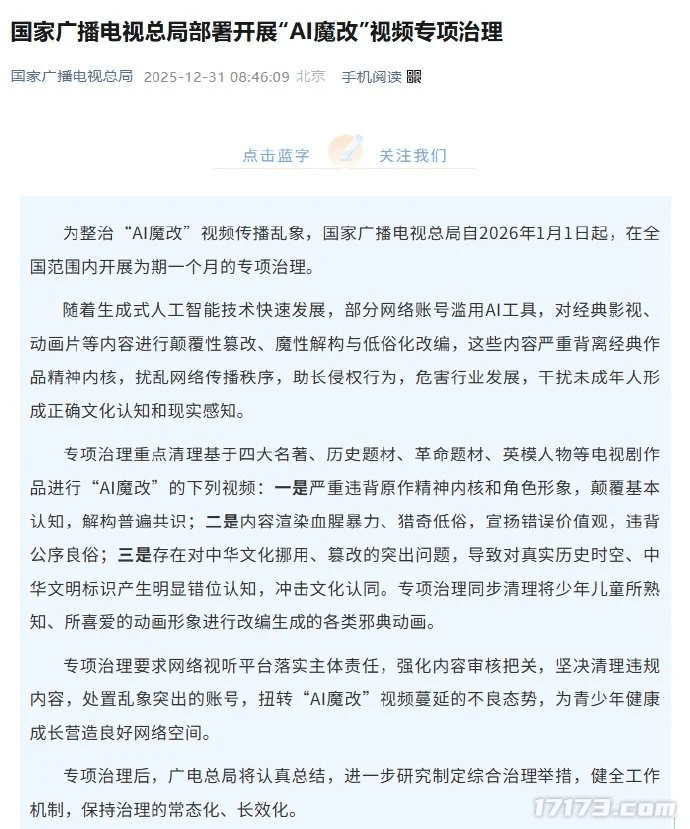 12月31日,国家广播电视总局正式发布通知,宣布自2026年1月1日起,在全国范围内开展为期一个月的“AI魔改”视频专项治理行动。