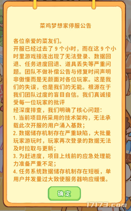 近日,由波波森林研发运营的《菜鸡梦想家》给玩家们整了个大活,游戏不仅开服炸服,还在炸服之后直接停服跑路,共计9小时的开服时间中,玩家能登陆的时间屈指可数。