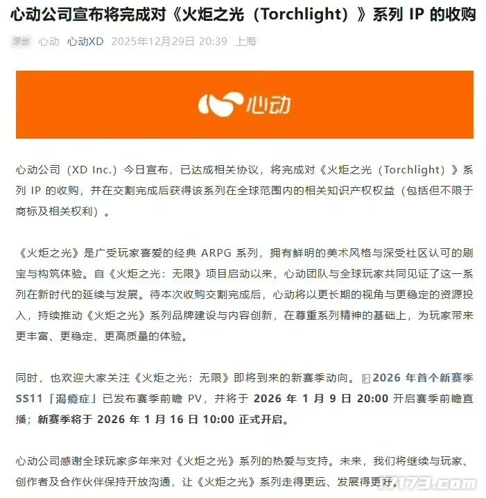 心动公司正式宣布,已与相关方达成协议,将完成对经典动作角色扮演游戏《火炬之光》系列IP的全面收购。交易完成后,心动公司将获得该系列在全球范围内的全部知识产权权益,包括但不限于商标、源代码、美术资产、社交媒体账户及相关权利。