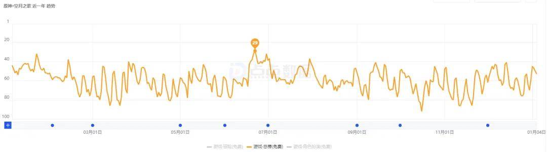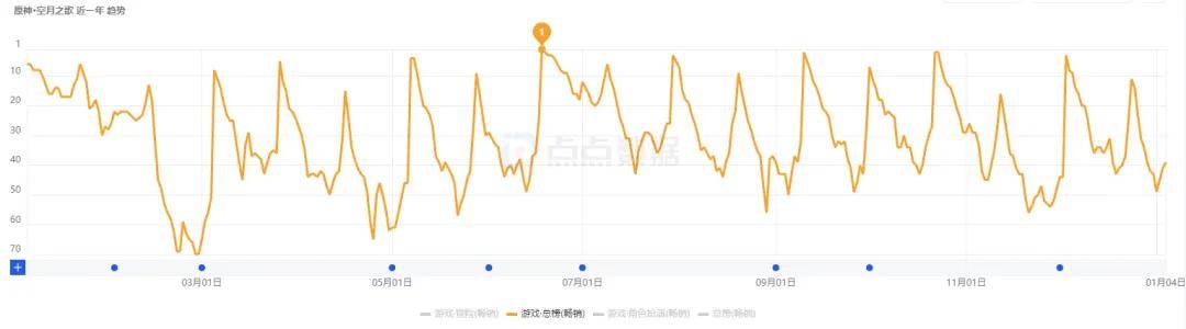 点点数据显示,《原神》近一年,基本上每次版本更新都能冲进App Store游戏畅销榜TOP20中,游戏免费榜名次也是多数时间都在TOP20-60之间浮动。