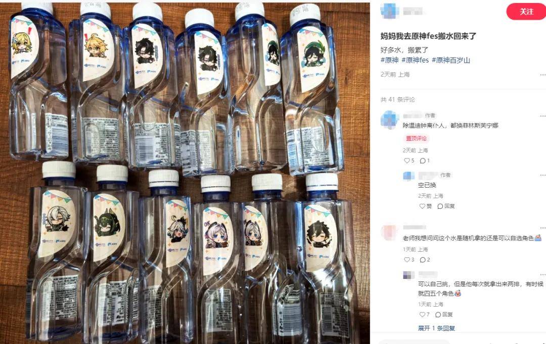 现场还排队发放《原神》特别款矿泉水,有的人为了集齐所有款式,甚至解锁了“我在原神FES捡瓶子”的成就。