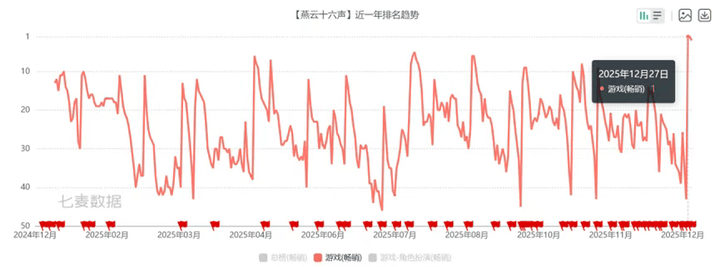 与那些公测即巅峰然后逐渐下滑的游戏不同,《燕云十六声》公测后数据相对稳定,并在周年庆时迎来爆发。此次周年庆,游戏送上价值258元的时装、69抽资源及多套新外观,同时用实际榜单表现证明了内容型游戏的长期生命力。