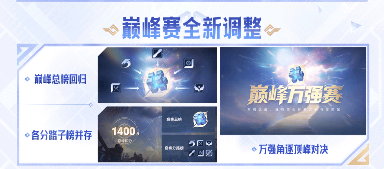 另外,下个赛季的巅峰赛也迎来了全新的调整,巅峰总榜回归,我们都知道这个赛季啊官方将巅峰赛设置为各个分路榜单。