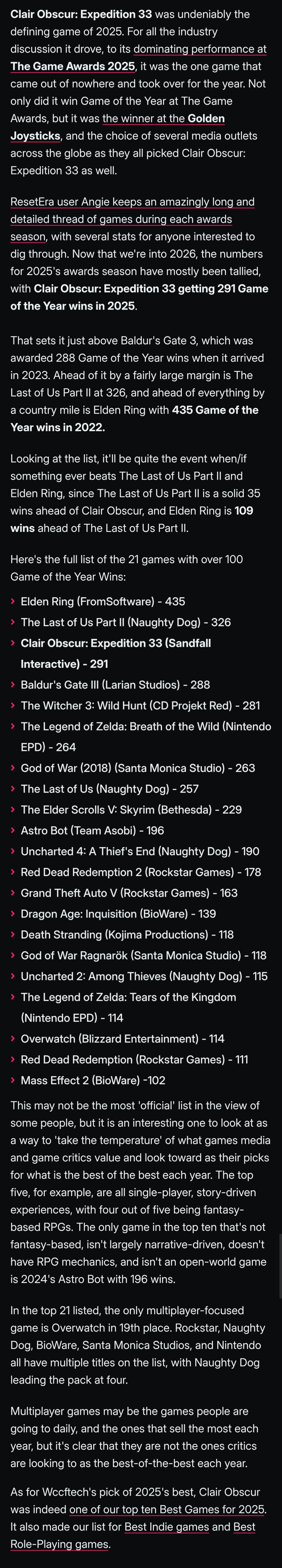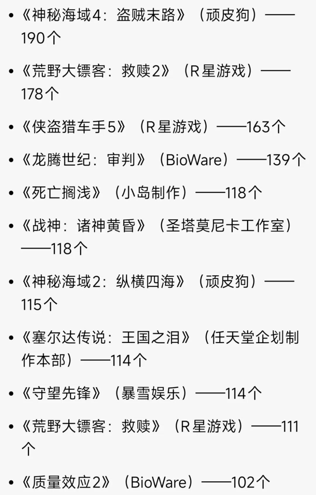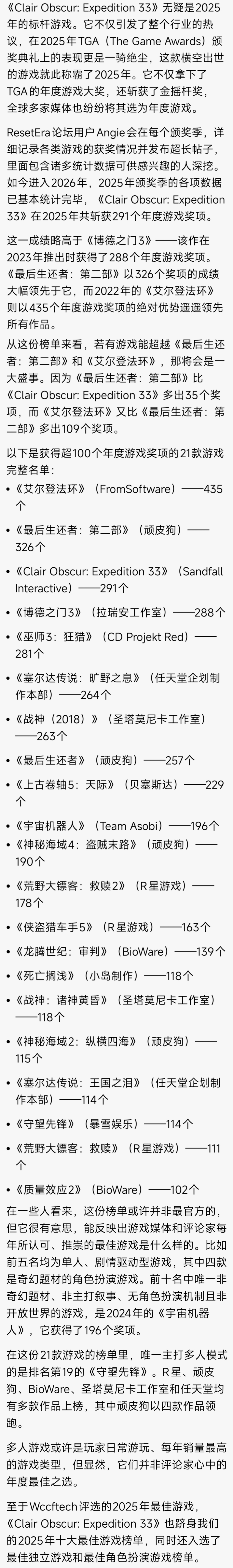 超级省流版:有国外用户统计了历年来各种游戏拿年度奖项的总数目,《33号远征队》总共291项,夺得第三名之位。