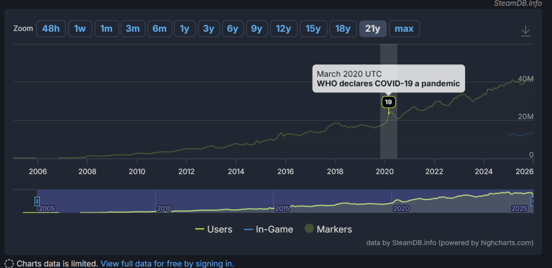 在Steam的发展轨迹中,创纪录的数据在两年后成为日常平均值,似乎已经是一件很平常的事情。这次4180万同时在线玩家的数据突破,不单单是促销引起的波动,更像是长期增长趋势的阶段性体现。