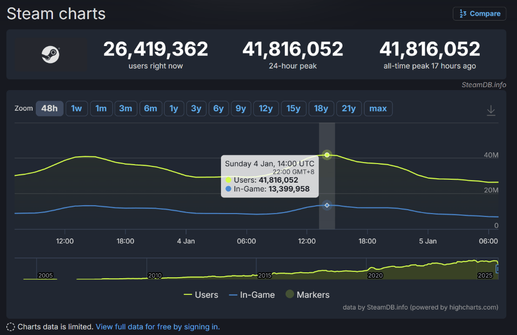 2025年10月,Steam同时在线人数刷新记录,达到了4160 万。三个月过去,这一数字再次被打破。
