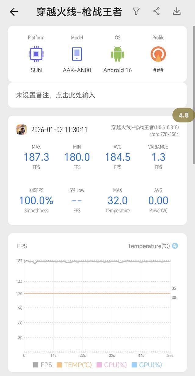 通过帧率图我们也可以发现,荣耀WIN可以实现《穿越火线-枪战王者》最高187.3帧平均184.5帧的游戏表现,既可以实现超高帧率又可以稳定输出超高帧率的游戏体验。